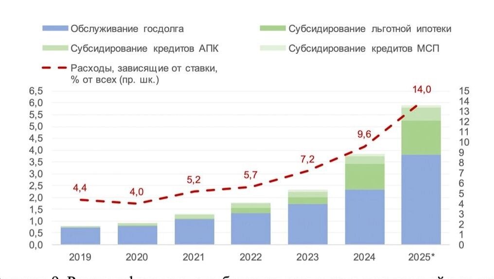 Эксперт ЦМАКП Эмиль Аблаев в обзоре «О сбалансированной бюджетно-налоговой политике» отмечает, что произошел значительный рост расходов на обслуживание госдолга и субсидирование льготных кредитов. Совокупный объем этих трат составит 5,9 трлн. А это 14% от всех расходов федерального бюджета.
